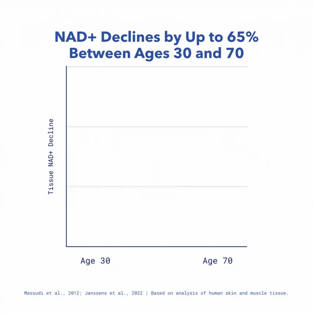 Your 37.2 trillion cells are powered by NAD+, a vital coenzyme that fuels cellular energy and repair throughout your entire body. NAD+ levels naturally decline with age, lifestyle factors, and stressors. Replenishing NAD+ levels is essential for maintaining your cellular health, energy, and vitality.