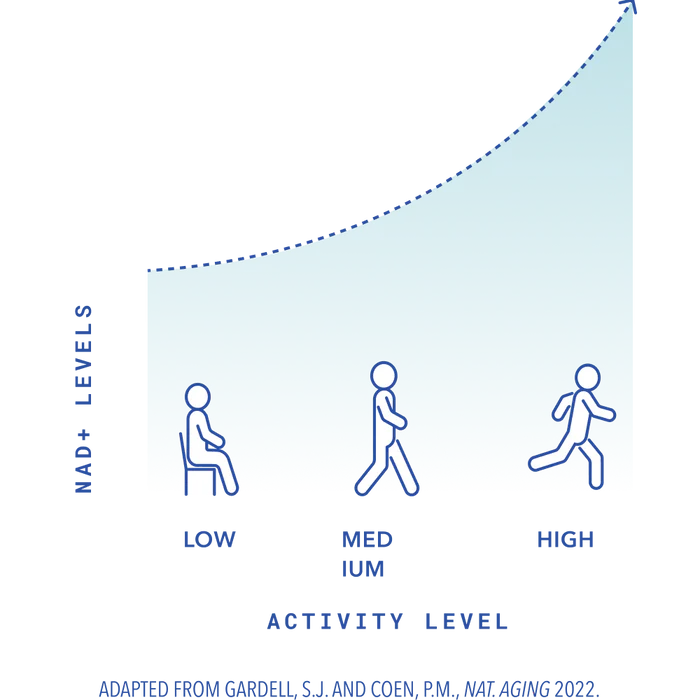 Clinical studies have shown that a sedentary lifestyle over time leads to lower NAD+ levels, which in turn can accelerate the signs of ageing. Regular exercise, combined with other healthy lifestyle habits, helps boost NAD+ levels, leading to a slower decline.