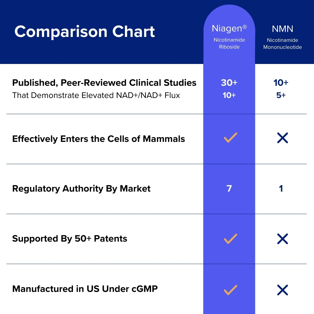 Niagen®, our patented form of nicotinamide riboside (or NR) and NMN (nicotinamide mononucleotide) are two of the most prominent NAD+ precursors on the market today. While it’s in our interest to promote NR, it’s also important to note that NMN does fall short as a dietary supplement when it comes to quality, scientific rigor, and regulatory acceptance.